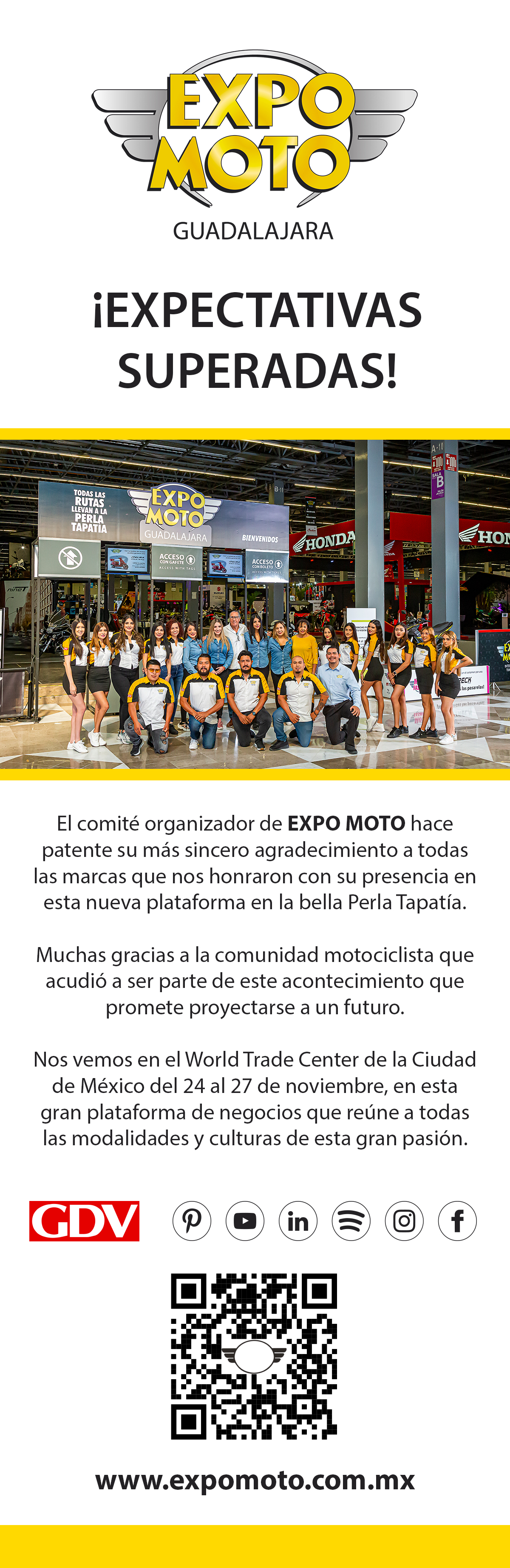 2016-05-28: Este correo electrónico y, en su caso, cualquier fichero anexo, contiene información exclusivamente dirigida a su destinatario. En caso de haber recibido este correo electrónico por error, se ruega notifíquese inmediatamente esta circunstancia a info@expomotonews.com Al mismo tiempo EXPO MOTO le recuerda que sus datos forman o formarán parte de un fichero registrado, propiedad de la EXPO MOTO. Usted tiene derecho de acceso, oposición, rectificación y cancelación a estos datos que deberá ejercer mediante escrito a la dirección anteriormente citada.Expo Moto es una marca registrada. Los logotipos de patrocinadores fueron proporcionados por la misma marca. Queda prohibido el uso de las imágenes difundidas en este correo. © 2013 EXPO MOTO Todos los derechos reservados.