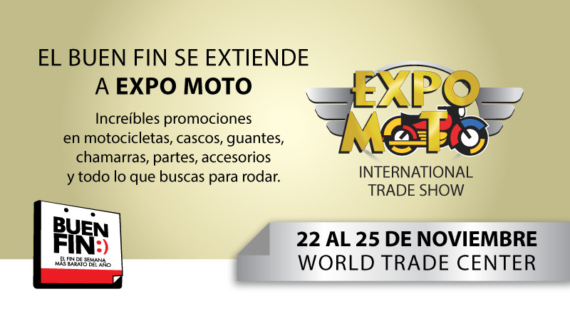 Las marcas líderes presentes en el mejor escenario, el World Trade Center de la Ciudad de México Después del EICMA de Millán, Expo Moto con los lanzamientos de los nuevos modelos de las marcas lideres: SUZUKI, KAWASAKI, INDIAN, HONDA, YAMAHA, BMW, KTM, HUSQVARNA, ITALIKA, BAJAJ, TVS, VENTO, TORINO, IZUKA y muchas más. | | | | |