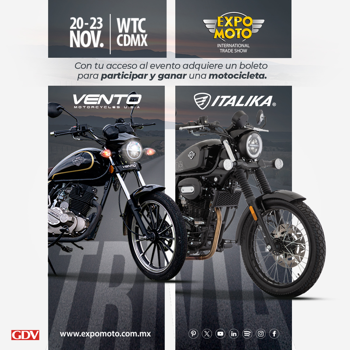 ¡El evento de motociclismo más importante del país ¡HA LLEGADO! El World Trade Center de la CDMX está listo para hacerte vibrar; te esperamos del 20 al 23 de noviembre. ¡Compra aquí tus boletos!