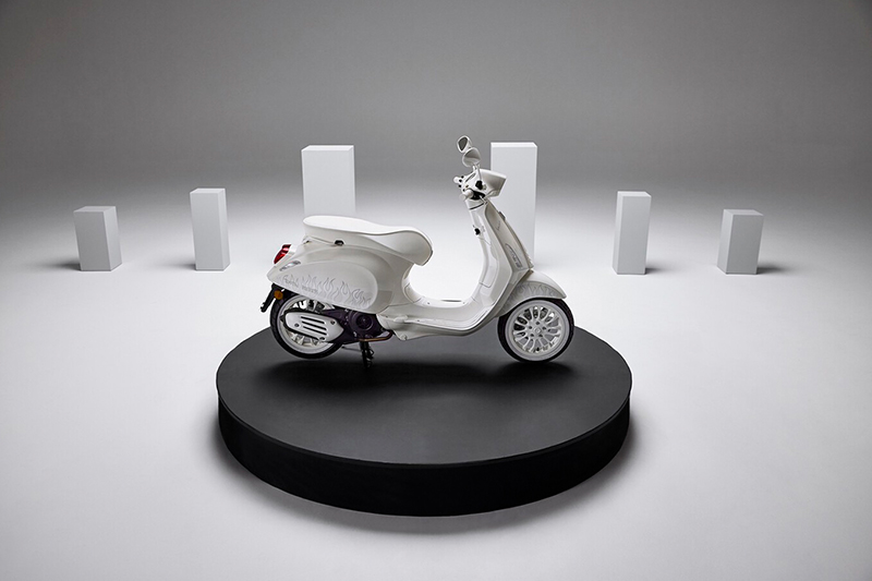La Bieber Vespa es minimalista y simple, y viene consigo un kit de accesorios exclusivos: bolso, guantes y un casco blanco, todo en total white, con un gráfico simil llamas y con la firma de Justin Bieber impresa.