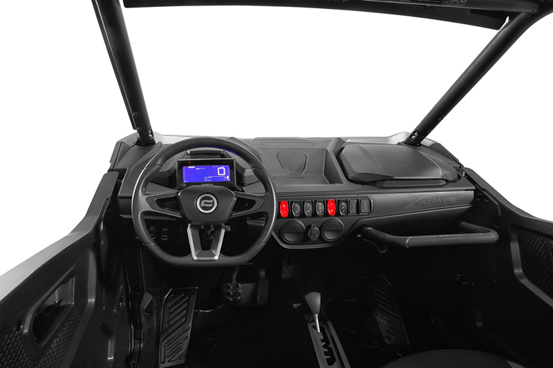 En cuanto a su carrocería con puertas completas hasta la cintura para mejor protección para los dos ocupantes. Los asientos son rediseñados y más ergonómicos, muy envolventes y con sujeción lateral. Las guías cuentan con un raíl lateral de cuatro rodillos para evitar que se atasque por la suciedad. Delante del conductor, tienes una pantalla LCD de 5″ resistente a la suciedad y el agua con información sobre el modo de tracción, velocidad, revoluciones, nivel de gasolina, temperatura de refrigerante, etc. En la parte central del salpicadero está protagonizado por una gran pantalla táctil desde la que puedes controlar todo lo relacionado con la conectividad y el info entretenimiento, con bluetooth para conectarse con el teléfono, reproducir fuentes externas de audio, toma USB e incluso conexión de cámaras que se pueden visualizar en la pantalla. El acompañante puede ajustar la barra en distancia para sujetarse perfectamente.