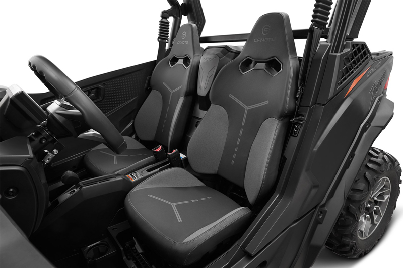 En cuanto a su motricidad, se puede elegir entre la tracción total o trasera apretando un botón situado en el salpicadero. También se puede hacer bloqueo y desconexión del diferencial delantero. Mediante una palanca ubicada entre los asientos, elegimos la marcha (automática CVT), punto muerto o posición de aparcamiento. También tenemos nuevas suspensiones, con mayor recorrido alcanzando hasta 307 milímetros delante y 317,7 detrás, ganando mayor capacidad de absorción y mayor confort. Si nos fijamos en los componentes, tenemos amortiguadores con botella separada, muelles lacados en rojo y regulación de la compresión y el rebote. También dispone de dirección asistida con dos reglajes diferentes mientras que el radio de giro se reduce hasta 10,5 metros. Otra de las grandes ventajas del CFMoto ZForce 950 Sport es la reducción de 25 kg en el peso en orden de marcha. También destacan sus ruedas, con llantas de aleación con diseño de turbina y 14 pulgadas de diámetro calzadas con neumáticos 27x9 delante y 27x9 detrás.