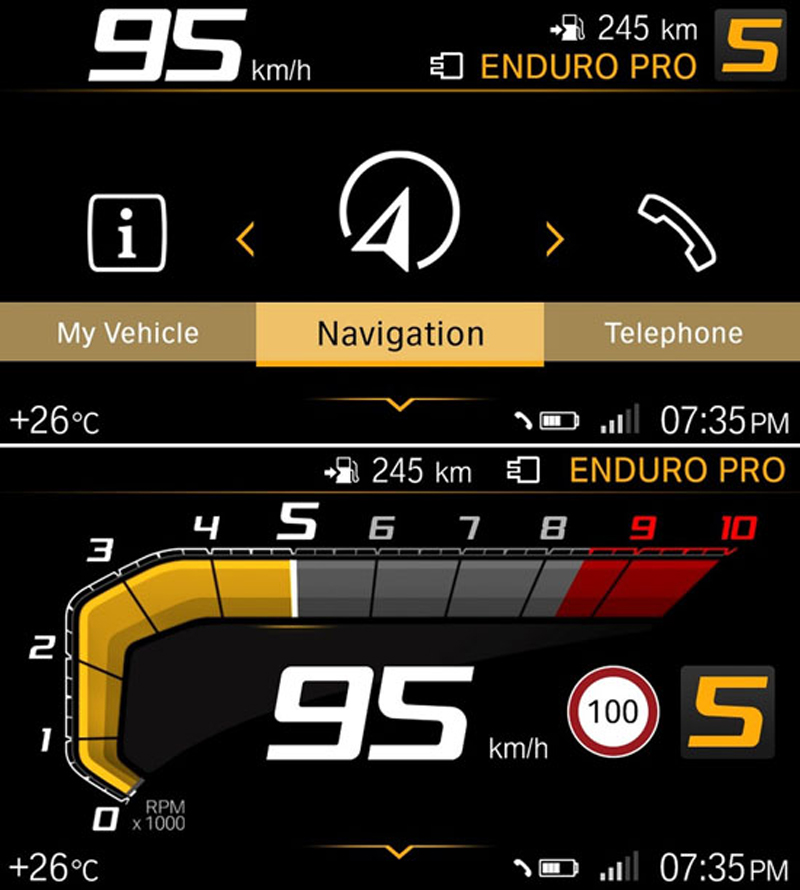 Se trata de una pantalla que funcionará a partir de una aplicación de nombre Connected App desde un smartphone vinculado, y cuenta con diversas funciones, como GPS, alertas de tráfico, servicio meteorológico, velocímetro, estados del camino a recorrer, escuchar música, recibir llamadas, entre otras, y para poderlas ejecutar será necesario tener puesto un casco adaptado.