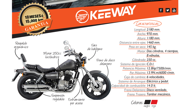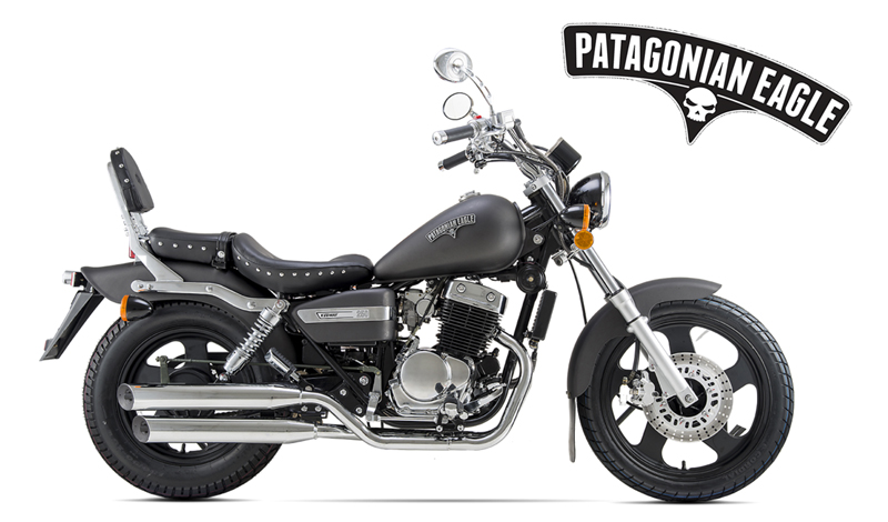 Adaptada a todos los gustos, necesidades y momentos de aquellos que desean vivir la libertad del camino. Diseñado entre los 60s y principios de los 70s con un aspecto custom chopper y conteniendo un doble cilindro, motor refrigerado por aire de 251cc que produce una impresionante potencia para su tamaño, la Patagonian Eagle es una máquina con mucho más: más estilo, más potencia y más capacidad. Componentes bien diseñados y detalles que se encuentran en todas partes: un escape cromado 2-en-2. Espectaculares ruedas de 5 radios, con 18-pulgadas (frente) y con 15 pulgadas (parte posterior). Un manubrio tirado atrás radicalmente. Un potente freno de disco delantero. Un tanque de combustible en forma de lágrima. Arranque eléctrico. Cilindro por fuera oculto con tapa de cromo. Todo se suma a una motocicleta de aspecto impresionante, una que no se disculpa con nadie. ¡Eso es libertad!