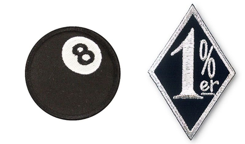 La bola negra con el número ocho también es uno de los parches más utilizados. Es un símbolo relacionado con el juego, y no con la práctica de la sodomía sexual, como suele decirse. Representa la vida como un juego, que en función de la suerte y de lo que arriesgues te puede ir mejor o peor.