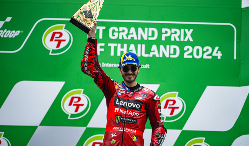 Francesco Bagnaia y el Ducati Lenovo Team consiguieron una importante victoria en el Gran Premio de Tailandia, disputado bajo la lluvia en el Chang International Circuit de Buriram. Enea Bastianini cruzó la meta en decimocuarto lugar tras sufrir una caída en la primera mitad de carrera.