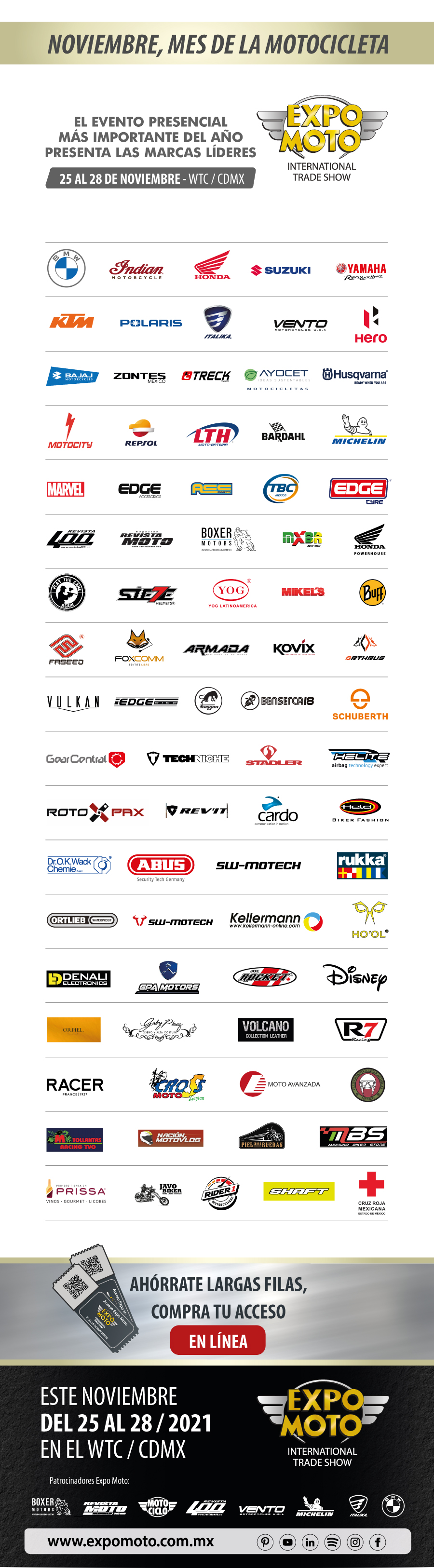 2016-05-28: Este correo electrónico y, en su caso, cualquier fichero anexo, contiene información exclusivamente dirigida a su destinatario. En caso de haber recibido este correo electrónico por error, se ruega notifíquese inmediatamente esta circunstancia a info@expomotonews.com Al mismo tiempo EXPO MOTO le recuerda que sus datos forman o formarán parte de un fichero registrado, propiedad de la EXPO MOTO. Usted tiene derecho de acceso, oposición, rectificación y cancelación a estos datos que deberá ejercer mediante escrito a la dirección anteriormente citada.Expo Moto es una marca registrada. Los logotipos de patrocinadores fueron proporcionados por la misma marca. Queda prohibido el uso de las imágenes difundidas en este correo. © 2013 EXPO MOTO Todos los derechos reservados.