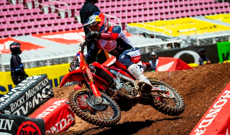 Roczen, ha estado lidiando con problemas de salud desde que llegó a Salt Lake, recibió más malas noticias hace unos días antes cuando dio positivo por herpes zóster, un virus conocido por su erupción extremadamente dolorosa. Pero Roczen, que todos sabemos que es un luchador, salió esta noche en el 450SX principal, se enfrentó al rápido Cooper Webb en la tercera vuelta, y terminó la vuelta en la delantera, la primera vez que lo hizo desde que visito ese circuito. Esta vez, sin embargo, se quedó allí hasta la bandera a cuadros, durante las 29 vueltas.