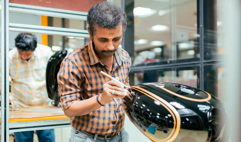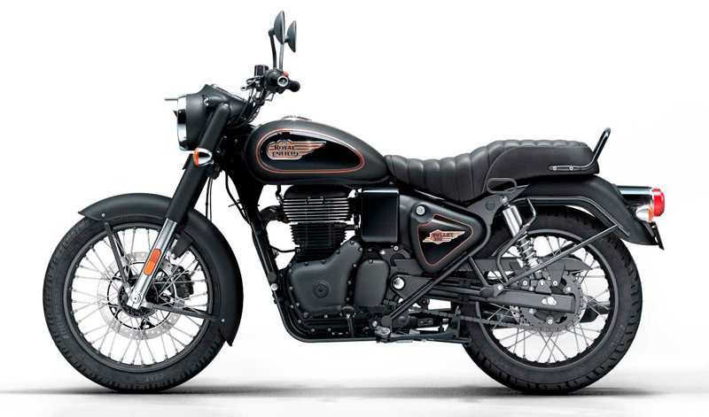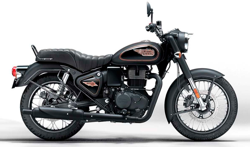 Está disponible en dos colores, Black y Maroon, con depósito -en forma de lágrima y de 13 litros-, tapas laterales y guardabarros con las líneas pintadas a mano y con logos cromados y dorados. La Bullet Black Gold (5.187 €) es la versión premium en color negro mate y de alto brillo en el depósito, con un logo 3D en cobre y oro, con finas líneas de color cobre y con el motor y los componentes oscurecidos.