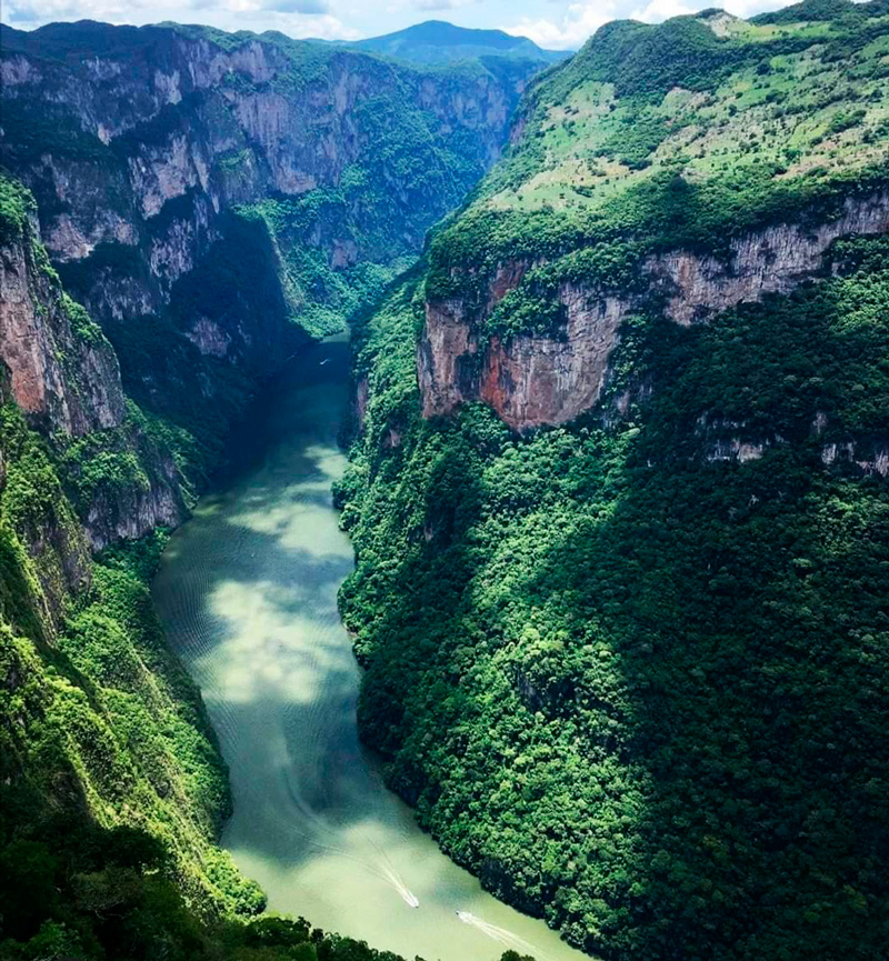 El Cañón del Sumidero consiste en un imponente acantilado, sus muros alcanzan más de 1000 metros de altura, la luz y el calor sobre las paredes del acantilado, así como sus abundantes escurrimientos han propiciado el surgimiento de varios microclimas en la vegetación y fauna en diferentes alturas del Cañón y se a convertido en uno de los paisajes más impresionantes de México, nominado desde hace tiempo para ser una de las Siete Nuevas Maravillas Naturales. El Cañón tiene un majestuoso balcón natural al Sumidero que tuvo su origen debido a un largo proceso de fallas geológicas. El Cañón es frecuentado por miles de visitantes que gustan de practicar la bicicleta de montaña, nado, el kayak y el Rapel. El parque es frecuentado por miles de visitantes que gustan de practicar en bicicleta de montaña, nado, kayak y rapel.