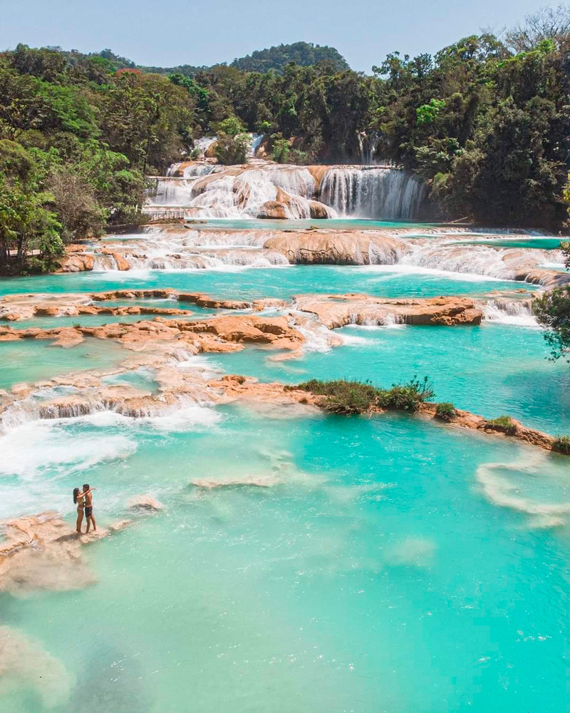 Las Cascadas de Agua Azul en Chiapas, es una reserva de la Biósfera y un área protegida con reconocimiento internacional por sus impresionantes cascadas blanquiazules fruto de las sales de carbonatos que llevan disueltas y el lecho calizo del río, estas cascadas se forman gracias a los afluentes del río Otulún, Shumuljá y Tulijá, en el estado de Chiapas. Esta zona cuenta con un sendero a lo largo de todo el río, en su recorrido podrás visitar varios miradores ubicados estratégicamente para obtener vistas panorámicas de las cascadas Agua Azul. Aunque el sendero tiene muchas escaleras, se encuentra muy bien señalado y en buenas condiciones, lo que evita que te pierdas del camino. El recorrido completo es de alrededor 2 kilómetros, pero puede sentirse como si fuera más largo, ya que el camino tiene muchas subidas. A pesar de lo cansado que puede ser, vale totalmente la pena pues en el trayecto verás el agua muy cristalina con su vibrante color turquesa que caracteriza a este maravilloso lugar. Los habitantes de esta zona son una comunidad indígena Tzeltal descendiente de los Mayas, quienes ofrecen a sus visitantes, comida, bebidas e incluso sus artesanías. Así que, el recorrido no se hace tan pesado, ya que te mantienes entretenido por un lado con las cascadas y por el otro con cientos de puestos. Después de apreciar los hermosos paisajes de Agua Azul y hacer una larga caminata, puedes meterte a disfrutar de su increíble balneario natural. Por toda la zona hay diferentes áreas para nadar con albercas o pozas naturales en donde puedes relajarte con la corriente del río.