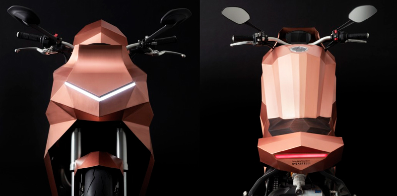 Según el inventor comenta, “se trata de desafiar la percepción de la vida útil de los objetos, es decir, la moto aprovechará la oxidación natural del cobre y su cuerpo se transformará de dorado a verde, creando así una experiencia estética única”.