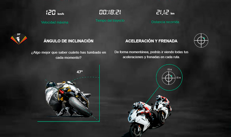 Comodidad Siente la comodidad de no tener que ocuparte de nada, poder dejar tu moto en cualquier lugar y saber que puedes controlarla en la palma de tu mano. Competencia ¿Quieres tener en tu mano la telemetría de competencia como los profesionales? con KOMOBI es posible gracias a la versión KOMOBI PRO. Podrás revivir todas tus rutas sabiendo cuánto tumbas en cada momento, la velocidad y el gas/brake entre otros.