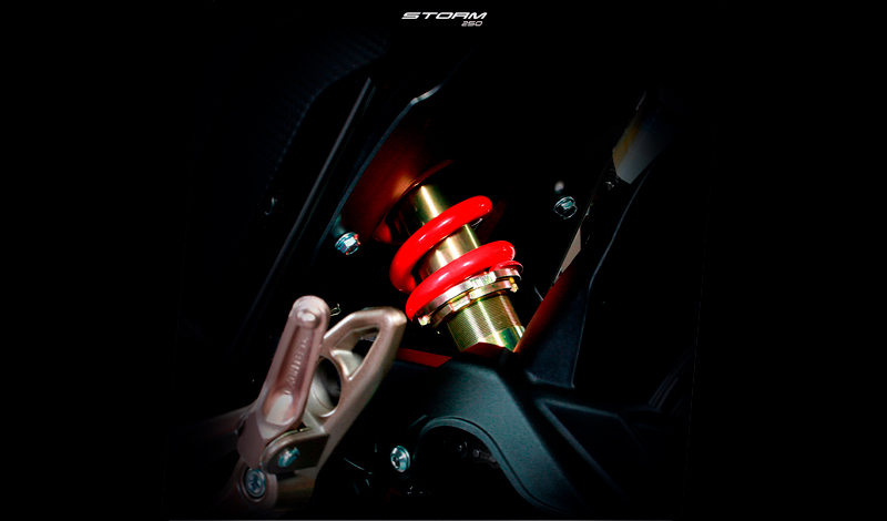 Rediseñó el sistema de suspensión de la Storm 250 cc e incluyó un monoshock trasero y una horquilla hidráulica frontal, para suavizar la manera de rodar por la ciudad.