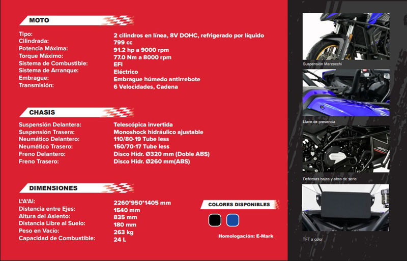 Impulsada por un potente motor bicilíndrico de 799cc, caja de 6 cambios, robusta suspensión y aderezada con sistemas electrónicos como frenos ABS de doble canal, la SRT 800 SX te permite disfrutar al máximo y con plena comodidad, todas tus experiencias y aventuras.