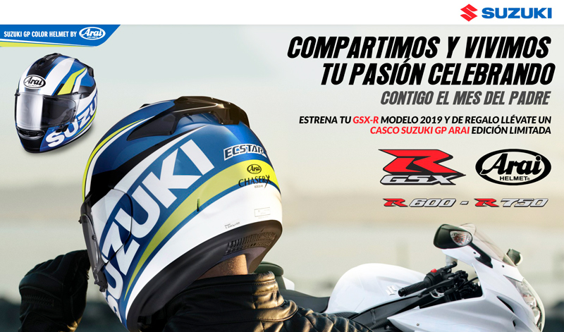 Y también para ti que te gustan las emociones más fuertes, Suzuki también piensa en ti, estrena de tu motocicleta GSX-R600 o GSX-R750 o GSX-R1000 y llévate un casco Suzuki GP Color Helmet by Arai con un valor de hasta $15,000, totalmente gratis.