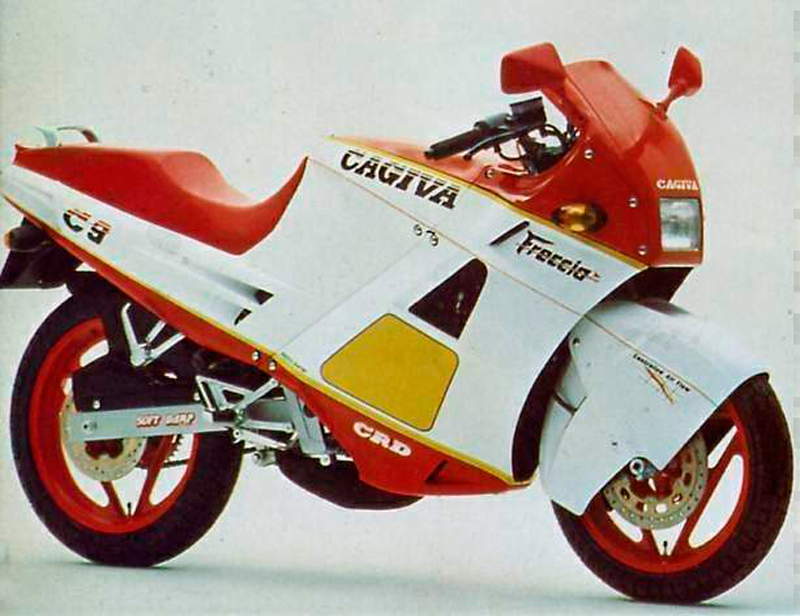 Freccia 125 C9 Por ultimo pero no menos importante es la Freccia 125 C9 producida en 1987 siendo una de las 125 de carreteras deportivas más completas del mercado. Era uno de los productos estrella de Cagiva. Equipado con un motor de dos tiempos de 27cv a 10.000rpm con arranque eléctrico y completamente rediseñado en comparación con el anterior y donde por primera vez aparece en los modelos de carretera de un sistema de control de escape, que es del tipo con válvula de escape doble por control mecánico CTS, que controla la altura de la lumbrera del escape y funciona entre un rango de 7.000 y 9.000 rpm. La Freccia C9 se comercializó en tres colores diferentes, rojo, azul y blanco.