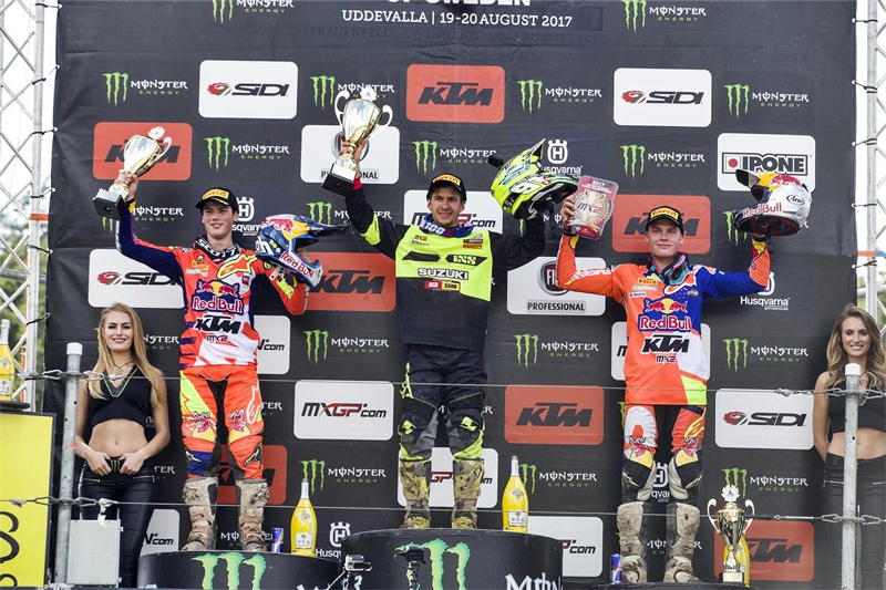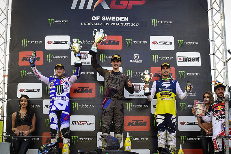 En la general MXGP SUECIA: 1. Tim Gajser (SLO, HON), 47 puntos; 2. Romain Febvre (FRA, YAM), 40 p; 3. Gautier Paulin (FRA, HUS), 40 p; 4. Clement Desalle (BEL, KAW), 36 p; 5. Glenn Coldenhoff (NED, KTM), 32 p; 6. Jeremy Van Horebeek (BEL, YAM), 29 p; 7. Antonio Cairoli (ITA, KTM), 26 p; 8. Evgeny Bobryshev (RUS, HON), 24 p; 9. Arminas Jasikonis (LTU, SUZ), 23 p; 10. Jeffrey Herlings (NED, KTM), 22 puntos.