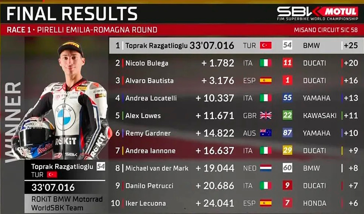 Toprak Razgatlolu, invencible durante todo el fin de semana, arruinó la celebración de Ducati en Misano al llevarse la victoria. Con este triplete, se consolida aún más como el líder del Mundial. Por su parte, Bautista, a pesar de su caída en la Superpole, logró un importante podio que lo mantiene en la pelea por el campeonato.