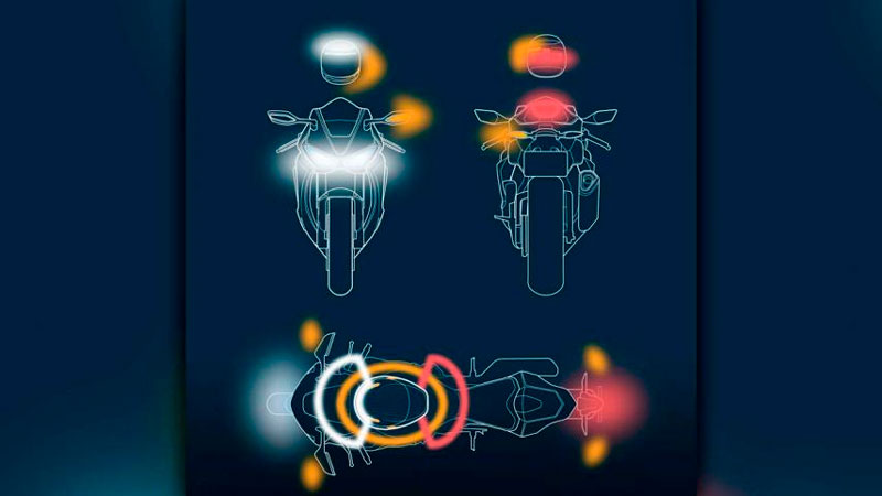 Asimismo, se integrará un sistema de iluminación en las partes frontales, delantera y trasera, generando mayor visibilidad de quien conduce y creando una sinergia entre la señal proyectada por la moto, tal y como se expone en la siguiente imagen.