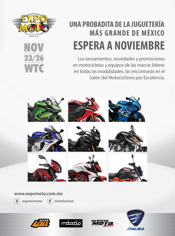 2016-05-28: Este correo electrónico y, en su caso, cualquier fichero anexo, contiene información exclusivamente dirigida a su destinatario. En caso de haber recibido este correo electrónico por error, se ruega notifíquese inmediatamente esta circunstancia a info@expomotonews.com Al mismo tiempo EXPO MOTO le recuerda que sus datos forman o formarán parte de un fichero registrado, propiedad de la EXPO MOTO. Usted tiene derecho de acceso, oposición, rectificación y cancelación a estos datos que deberá ejercer mediante escrito a la dirección anteriormente citada.Expo Moto es una marca registrada. Los logotipos de patrocinadores fueron proporcionados por la misma marca. Queda prohibido el uso de las imágenes difundidas en este correo. © 2013 EXPO MOTO Todos los derechos reservados.