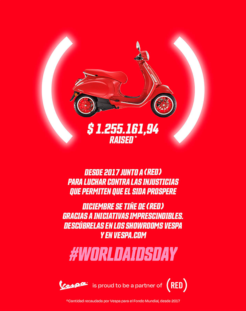 Vespa y (RED) comenzaron a colaborar hace 6 años para apoyar la conocida asociación sin ánimo de lucro que fundaron el cantante de U2 (Bono) y el periodista Bobby Shriver. Para celebrar esta unión, Piaggio lanzó unas versiones especiales de su carismática motocicleta, al tiempo que también lanzaba una colección específica de ropa y accesorios disponible en la red oficial de concesionarios para recaudar fondos. Desde el comienzo de esta unión, Vespa ha contribuido ya con 1,255.000 dólares al Fondo Mundial, una cifra que esperan seguir aumentando próximamente. Por ello, una manera de incentivar todavía más los modelos Vespa (Red) es incluir un cheque para accesorios originales con la adquisición de cualquiera de ellas. Esta promoción permanecerá vigente hasta el próximo sábado 31 de diciembre de 2022 en las cuatro Vespa.