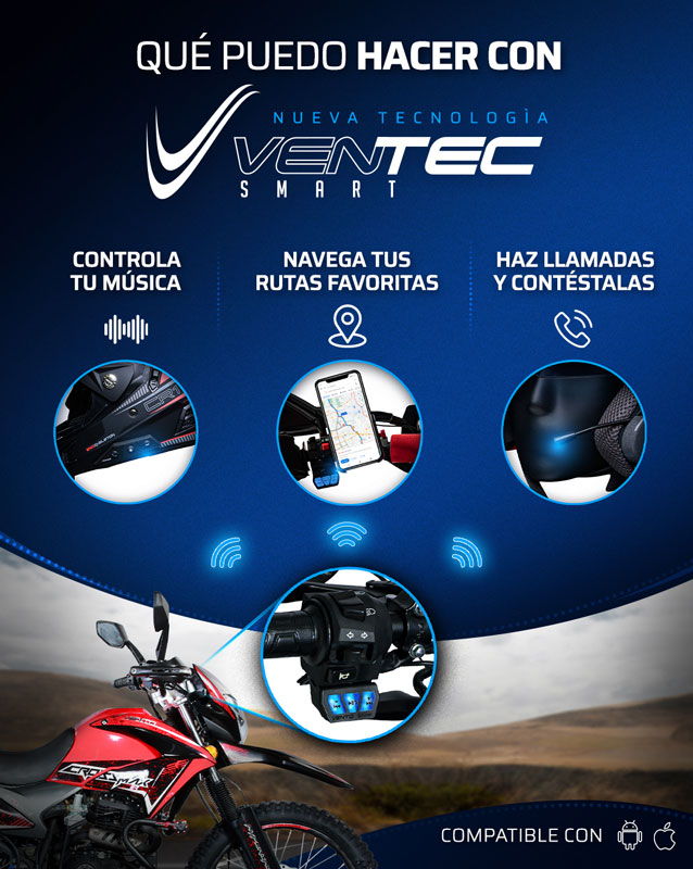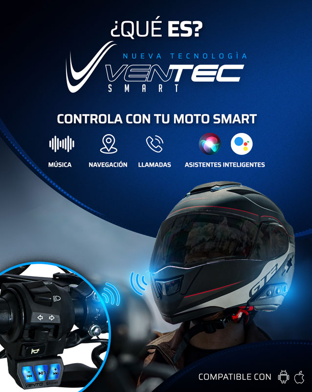 En todas las motos Vento 2023 viene integrado el nuevo Centro de Comando, el cual te otorga control completo de tu conectividad. Sin quitar las manos del manubrio, podrás controlar el volumen de tu música, pausar o cambiar de canción, contestar llamadas, y lanzar tu asistente inteligente favorito. Este Centro de Comando es el punto de conectividad entre tu motocicleta y nuestra nueva línea de cascos VenTec.
