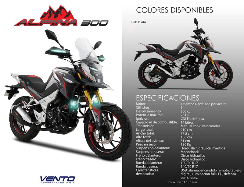 De igual forma, este 2022 trajo consigo el lanzamiento de lo que, hasta hoy, es uno de los modelos más ambiciosos de la marca: la Alpina 300. Este nuevo integrante a la familia irradia un espíritu aventurero, dinamismo y muchísima autoridad para recorrer cualquier camino. Este modelo nos presenta un motor 300cc de 4 válvulas de 26 caballos de fuerza capaz de alcanzar una velocidad pico de 130 km/h. Además, cuenta con un radiador de aceite que ayuda a mantener la temperatura del motor baja y constante para entregar un desempeño uniforme y preciso en carretera. También posee 6 velocidades que te hacen rodar más rápido con menos esfuerzo y alargan la vida del motor.