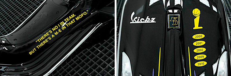 La marca de ropa deportiva KICKZ subastará una motocicleta Vespa Primavera 50 Mamba Edition en color negro, personalizada con los colores morado y amarillo, propios del equipo en el que Bryant jugó por veinte años. Con los Lakers ganó cinco anillos NBA, tres oros olímpicos, se posicionó como el tercer máximo anotador en la historia de la NBA y acumuló múltiples récords.