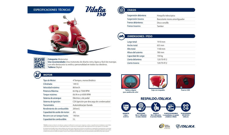No lo pienses más, entra ahora mismo a  italika.mx y comienza a disfrutar del estilo retro que resaltará tu imagen en cualquier camino. Aquí también podrás conocer todas las opciones en movilidad eficiente que tienen para ti, por eso ITALIKA es el motor de tu vida. Te dejamos su ficha técnica para mayor información: