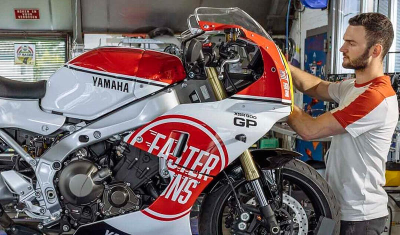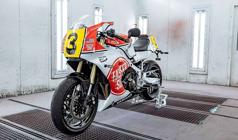 La Yamaha XSR900 GP lleva un semicarenado pero en este caso es integral y en vez de tener el círculo rojo con la leyenda Lucky Strike lleva el lema “Faster Sons” de la gama XSR. La moto está tan bien hecha que, a pesar de montar intermitentes, espejos, faro y porta-matrícula, parece un modelo de competencias. Integra un detalle peculiar de colín con el número 3 de Mamola en fondo amarillo, en aquella época en la categoría reina todos los dorsales tenían de fondo ese color.
